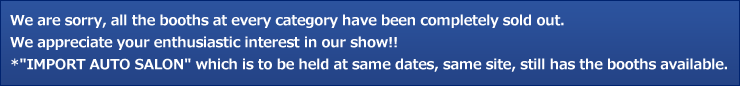 Only show managementfs designated vehicle spec-boards, carpets, individual lights, reception counter tables, stools and catalog-stands (rental w/fee available) are permitted for display along with a vehicle. Show management will determine display locations.