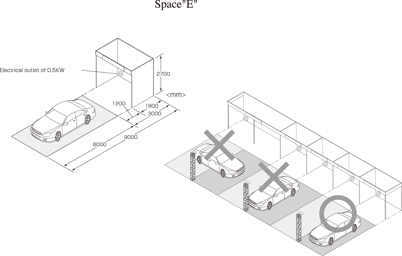 Space gEh is a combination of one space with *basic booth fixture and vehicle only display space (like Space B). Each exhibitor can rent up to 3 spaces.