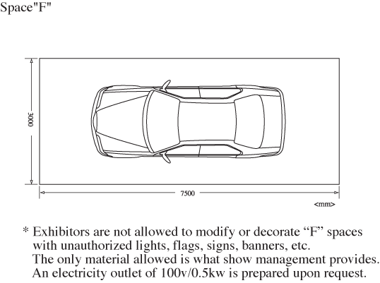 Space gFh is designated as a vehicle only display space. Each exhibitor can rent up to 2 spaces. Electricity outlet is equipped which can be used only to demonstrate the exhibitorfs own product(s).