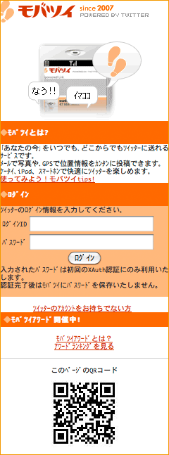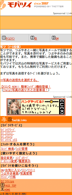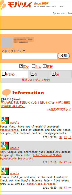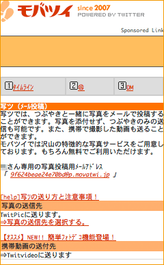 あなたのツイッター画面が表示されます。携帯のダイヤル7を押すか、「写ツ」をクリックしてください。