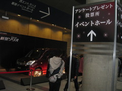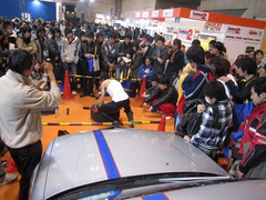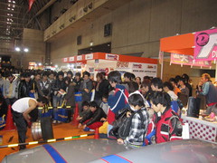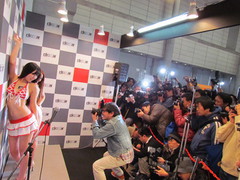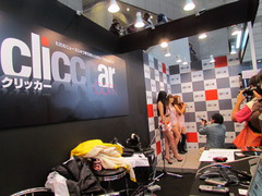 キャンギャルのステージ登場があるかと思えば、脇で必死にブログをアップする編集長。(場所は、東・8ホール)