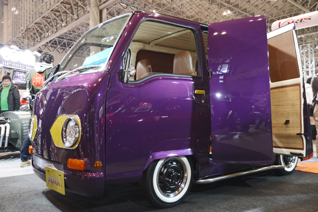 艶やかなメタリックパープルのボディにエアーブラシペイントが施された派手なエクステリア。アメリカンなムード満点なカスタムが施されたスバル・サンバーがベースの「Puprican」は、専門学校 静岡工科自動車大学校ボディデザイン研究科の学生さんたちの作品です。製作にかかった期間は86日。