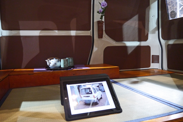 ボディサイドに設けられた観音開きのドアをあけると、そこに現れるのは外観とは正反対な和の空間。畳敷きのフロアには茶道具が置かれ、その静謐な雰囲気はまさに茶室そのもの。まさか、この派手なクルマの中に茶室が広がっているとは誰も想像しないでしょう。「和洋折衷、エクステリアとインテリアの正反対なイメージが面白いと思って製作しました」と、学生の皆さん。これは、発想の勝利ですね。