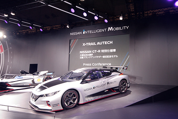 リーフのレーシングバージョン、フォーミュラE参戦マシンなどをステージ上に展示した日産自動車のブース。同社のブランドアンバサダーに就任したテニスプレイヤー、大坂なおみ選手にちなんだスペシャルなGT-Rも注目を集めています。すでに先行予約分は完売したという貴重な限定モデルをチェックできる貴重な機会となっています。また、エクストレイルをベースに大胆なカラーリングとした「Naomi Osaka Concept」や、ジュークのタイヤをクローラーに変えたアドベンチャーコンセプト」もアグレッシブで勢いを感じます。さらに、本日発売された「エクストレイル オーテック」もお披露目。電気・スポーツカー・SUVと様々なジャンルのマシンが並んでいるブースです。