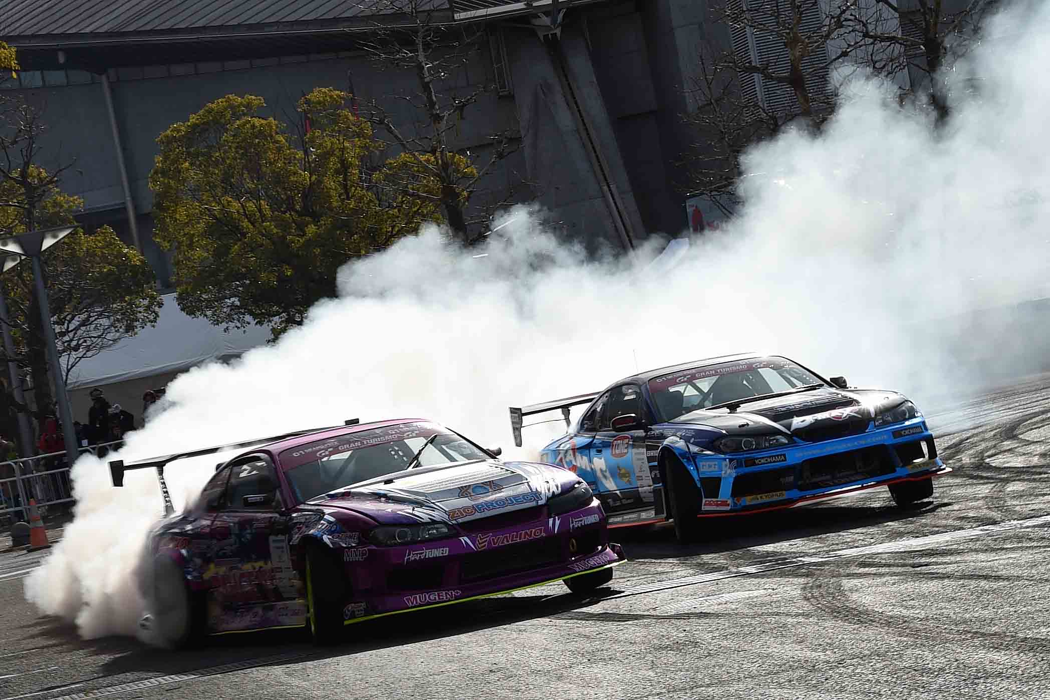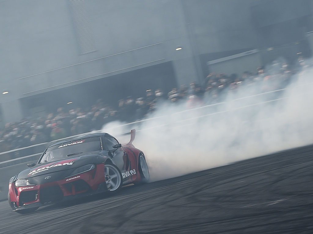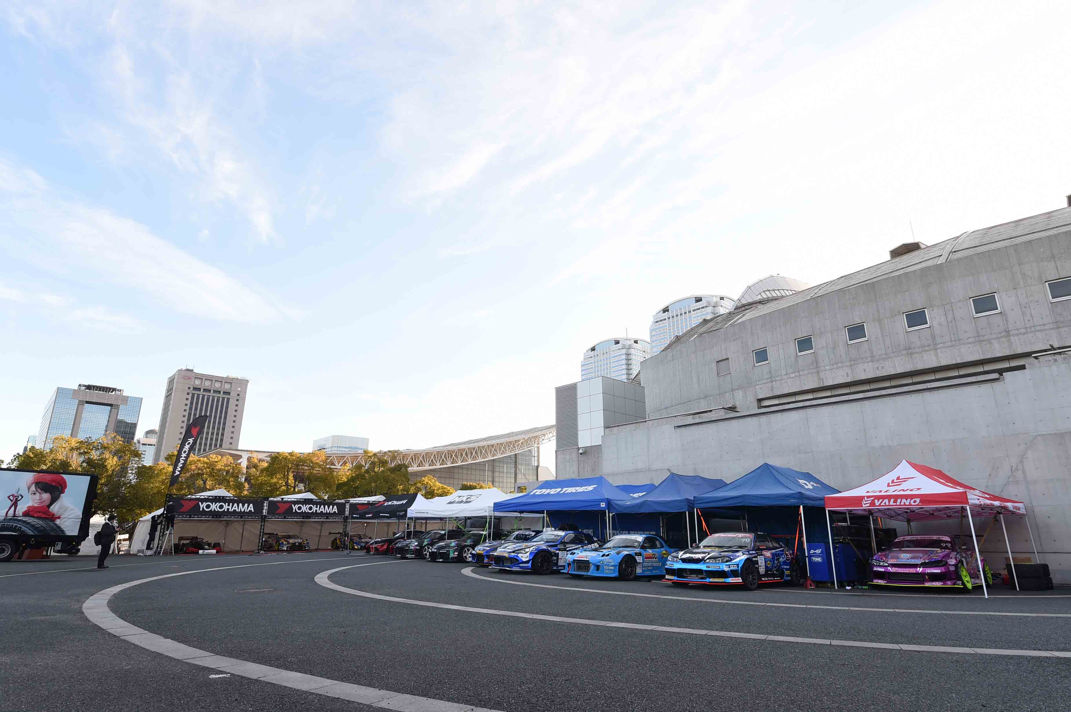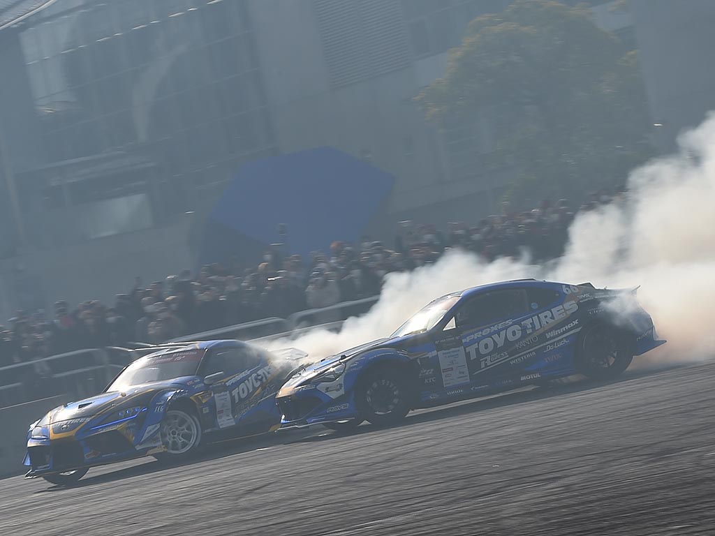 一般公開日初日、屋外イベント会場での走行パフォーマンスもスタートします。まずはD1車両がこの小さなスペースでタイヤから白煙を上げて派手なパフォーマンスを行う「D1GP Kick Off DRIFT」からスタートです。