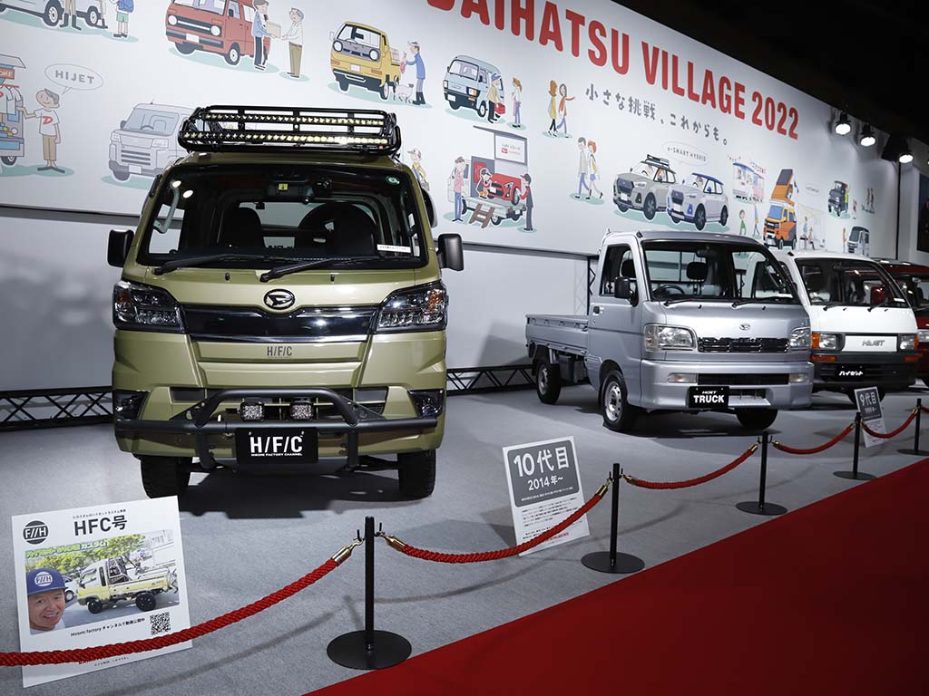 「東京オートサロン2022」のダイハツブースでは、「DAIHATSU VILLAGE 2022 小さな挑戦、これからも。」をテーマとし、4台のカスタムモデルを中心に多くの車両を展示。なかでも迫力満点なのが、会場奥にずらりと並べられたハイゼットトラックです。