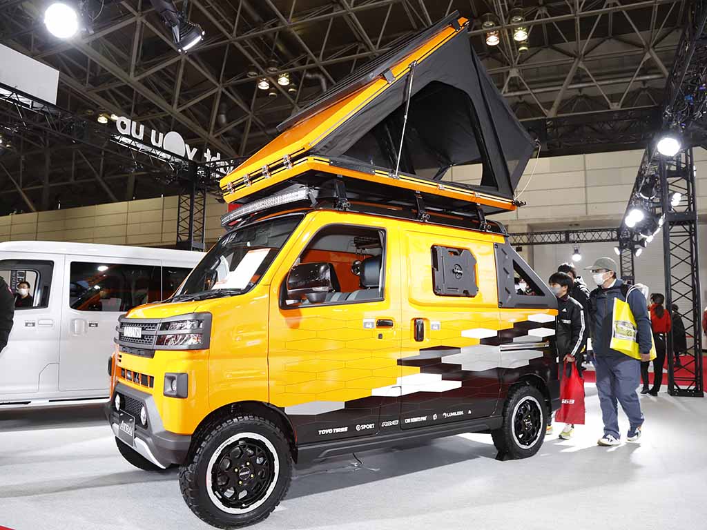そしてブース中央には、2021年12月にフルモデルチェンジを受けたばかりの軽ワンボックス、アトレー・デッキバンをベースとしたキャンパーパージョンが展示されました。「私の4LDK(軽)」をコンセプトに掲げ、運転席、荷物部屋(リアシート)、寝室(ルーフテント)、そしてベース車両の特徴でもある荷台スペースにはお風呂が設置され、クルマ全体を1台の家としてデザインしていています。