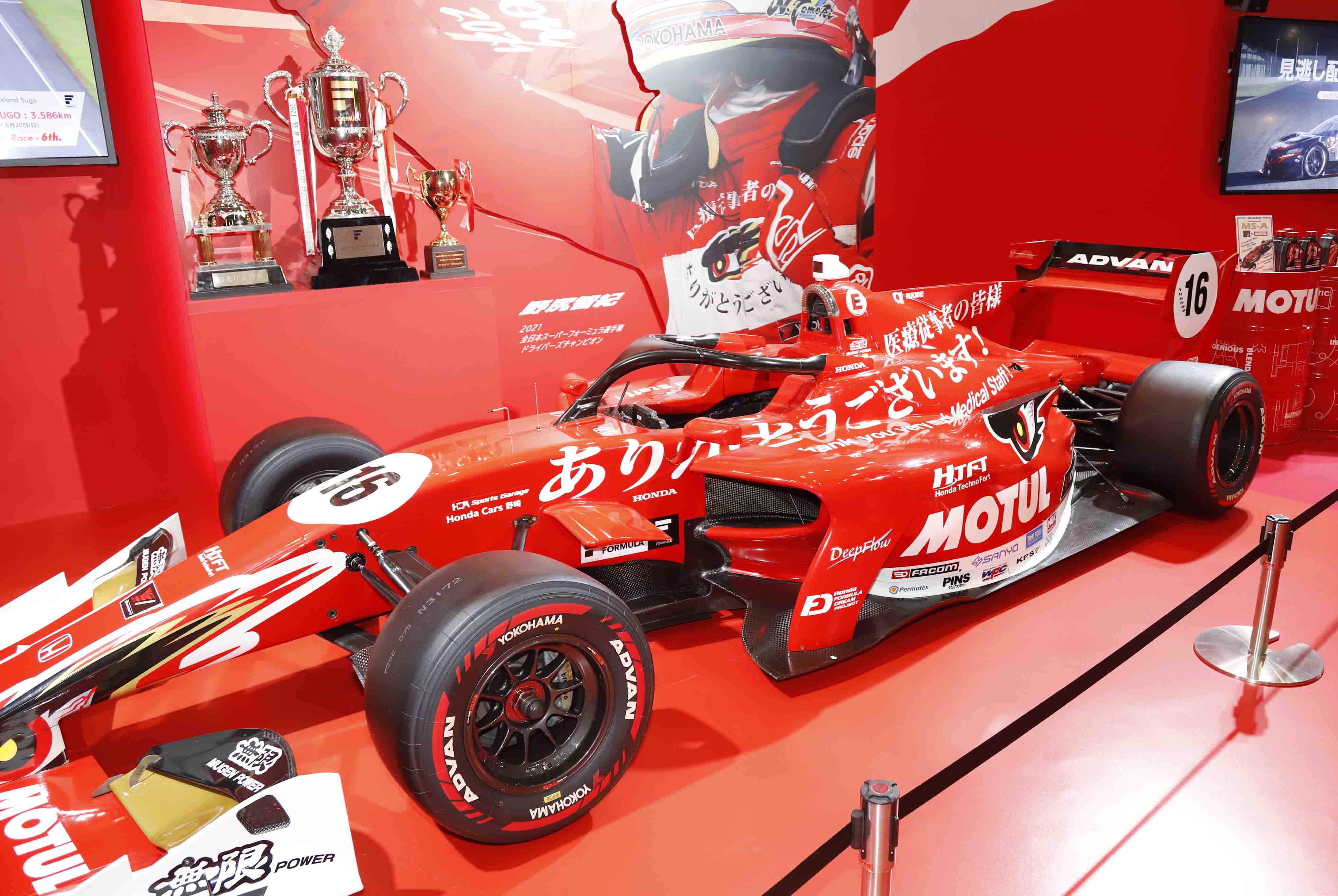 展示車両において必見なのは、2021年の全日本スーパーフォーミュラ選手権シリーズにおいて、野尻智紀選手がシリーズチャンピオンを獲得した16号車TEAM MUGEN SF19。マシンサイドに描かれた、医療従事者のメッセージは多くの話題を呼び、また勇気づけられたという方も多いことでしょう。