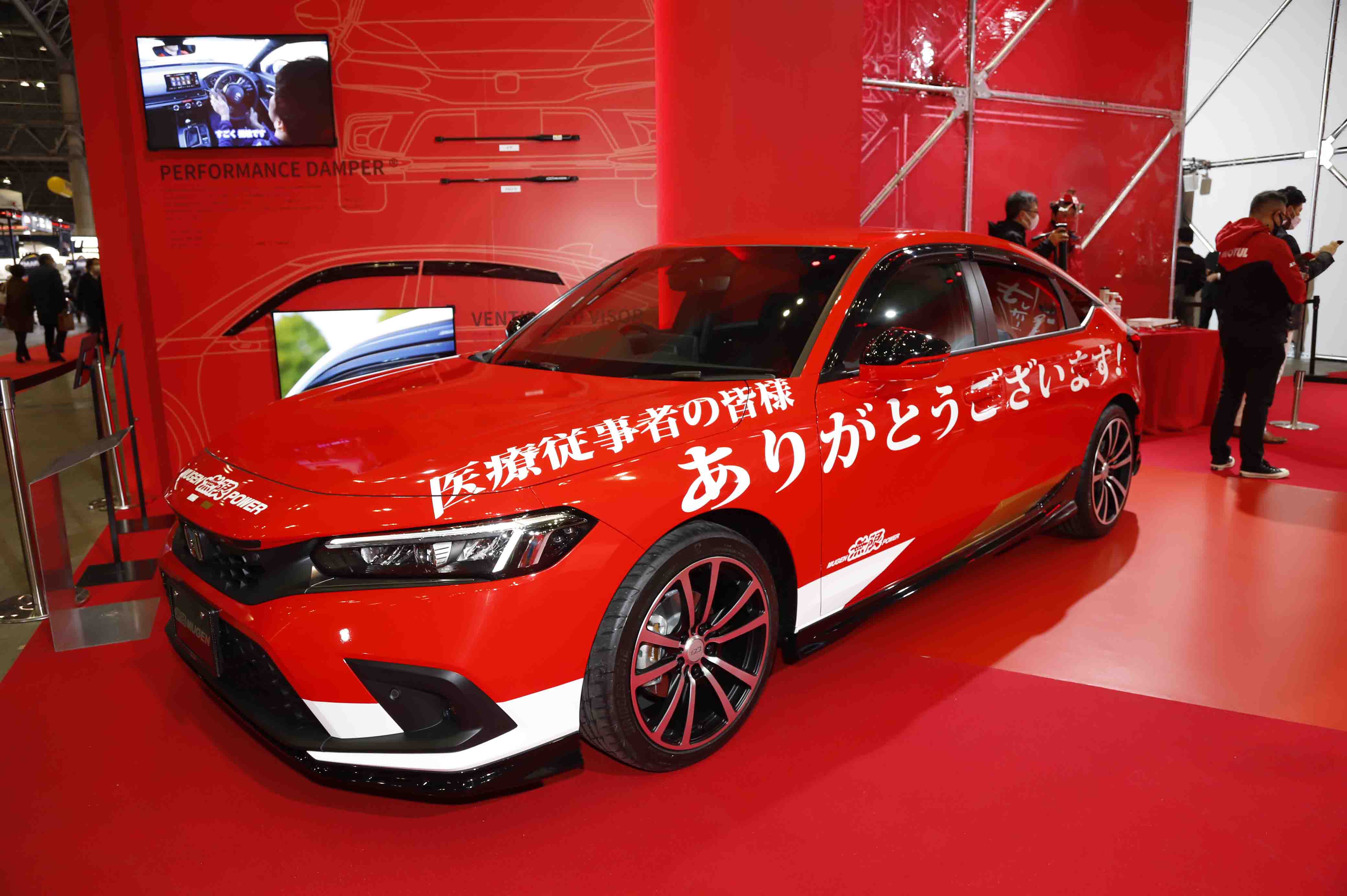 また市販車両向けパーツでは、最新のシビック用パーツ装着車両を展示。発売中のシビックには、外装色にプレミアムクリスタルレッド・メタリックの設定がありますが、それとは異なる明るめのレッドを見に纏う展示車両には、エアロパーツやホイールなどを装着。4枚のウィンドウをわずかに開けておけば、車内の空気を積極的に外へ排出してくれるベンチレーテッドバイザーや、ボディの振動を制御し上質な走行フィールを与えてくれるパフォーマンスダンパーなどが展示されています。