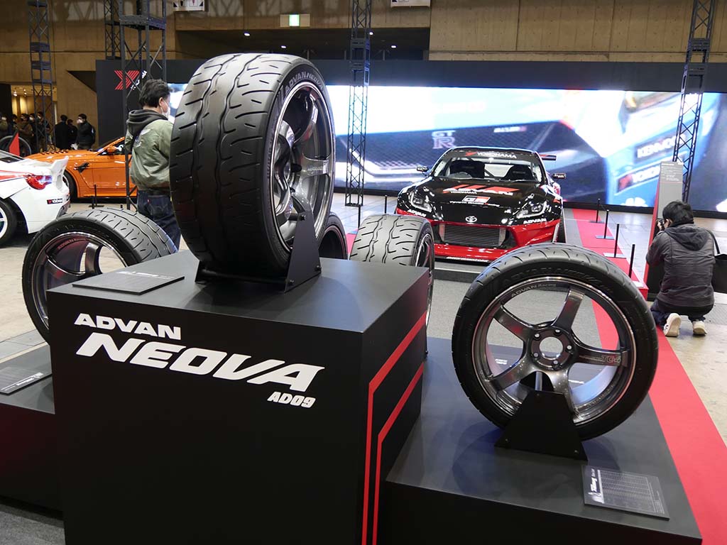 横浜ゴムブースの中央に鎮座するタイヤは、2020年12月に発表されたばかりのADVAN NEOVA AD09です。ストリートユーザーをメインターゲットとし、走りやカスタムチューニングを楽しむストリートユーザーがメインターゲット。その性能や特徴を表現したプロモーションムービーを、ブース内の大スクリーンで楽しめます。