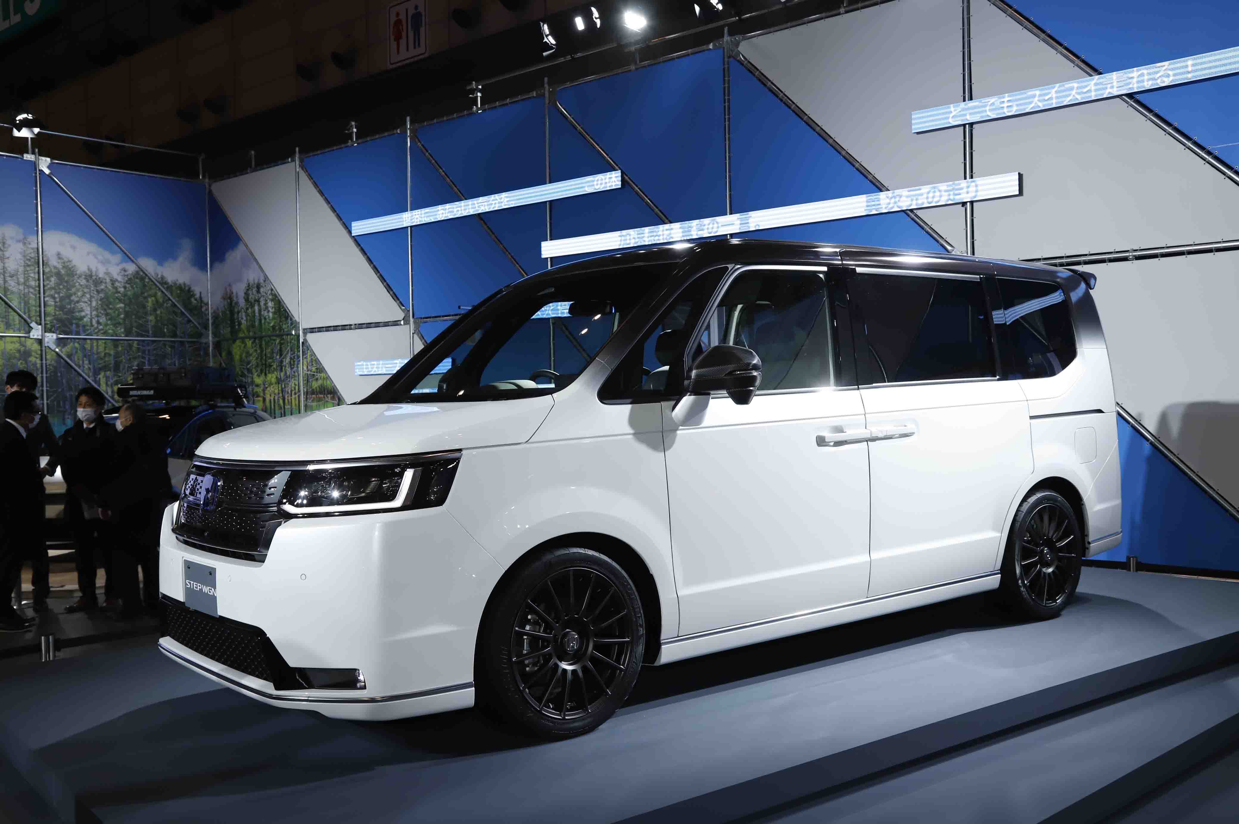 エコ(e:HEV)エリアの中央、お立ち台のようなステージに展示されるのは、2022年春に正式発表が予定されている新型ステップワゴンSPADAのカスタムモデル。ベース車両はe:HEV(ハイブリッド)のパワーユニットを搭載するSPADAで、専用の脚まわりによるローダウンのほか、18インチの専用ホイールを装着。遠くからは2トーンカラーのように見えるルーフは、じつはラッピングによる表現。グロスブラックのルーフは、ピラーのところでグラデーション処理されてボディカラーに馴染むという凝った処理がなされています。