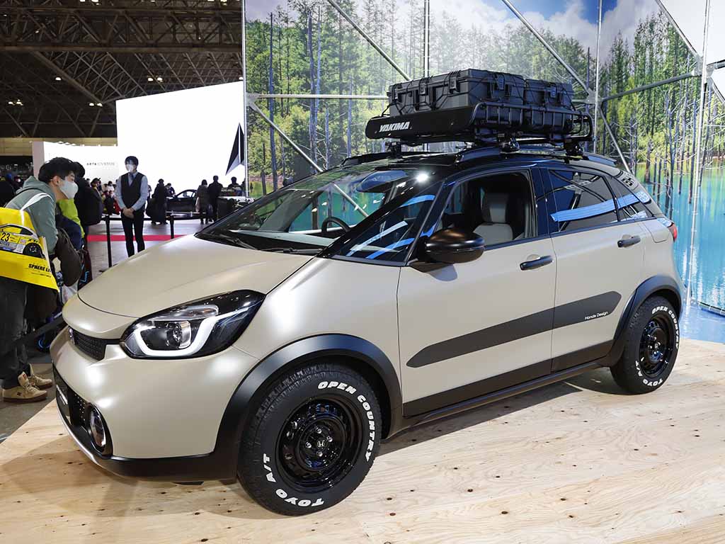 ブースの左側に位置するのが、アウトドア志向なカスタムエリア。フィット e:HEV CROSSTAR カスタムは、オンライン開催となった東京オートサロン2021で公開された車両をさらにブラッシュアップ。「アーバンなアウトドア」をコンセプトに、フロントまわりのデザインを変更したほか、サンドベージュ系のボディカラーに全塗装。オフロードタイヤやルーフキャリアを装着し、アウトドア・カーライフという新しい提案を行っていくスタディモデルだそうです。