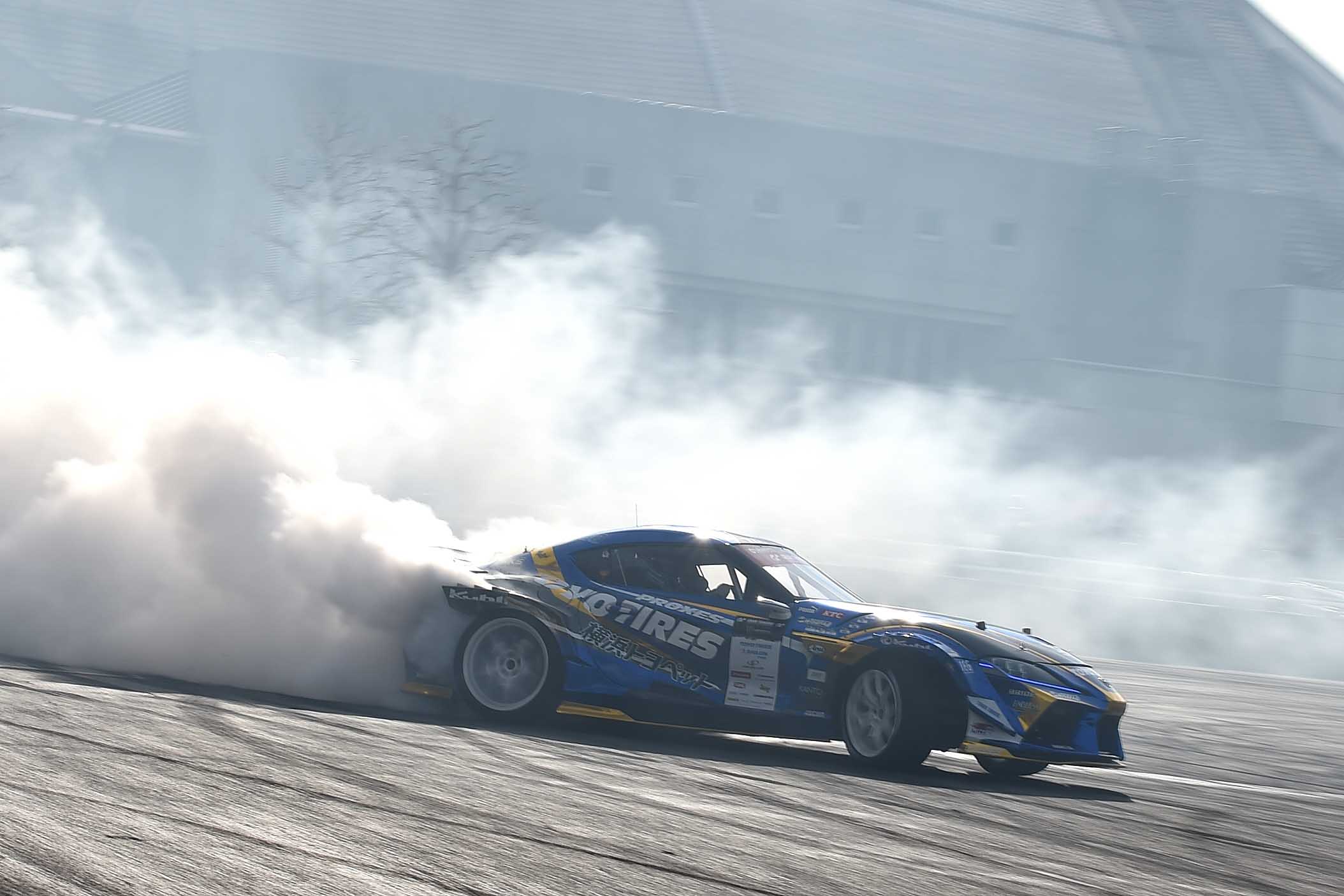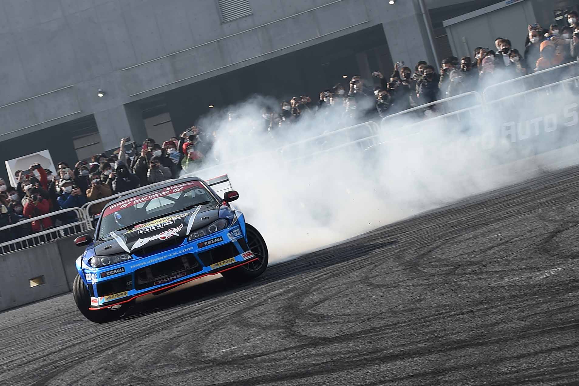 東京オートサロン2022屋外イベント会場では、新年恒例ともなっているドリ車の走り初めが「D1GP Kick Off DRIFT」である。D1GPの2021年シーズン・チャンピオンとなった中村直樹選手(S15)以下、横井昌志選手(S15)、松井有紀夫選手(FD3S)、藤野秀之選手(ZN6)、齋藤太吾選手(A90)、川畑真人選手(A90)のトップドリフター6名がドリフトパフォーマンスを行った。