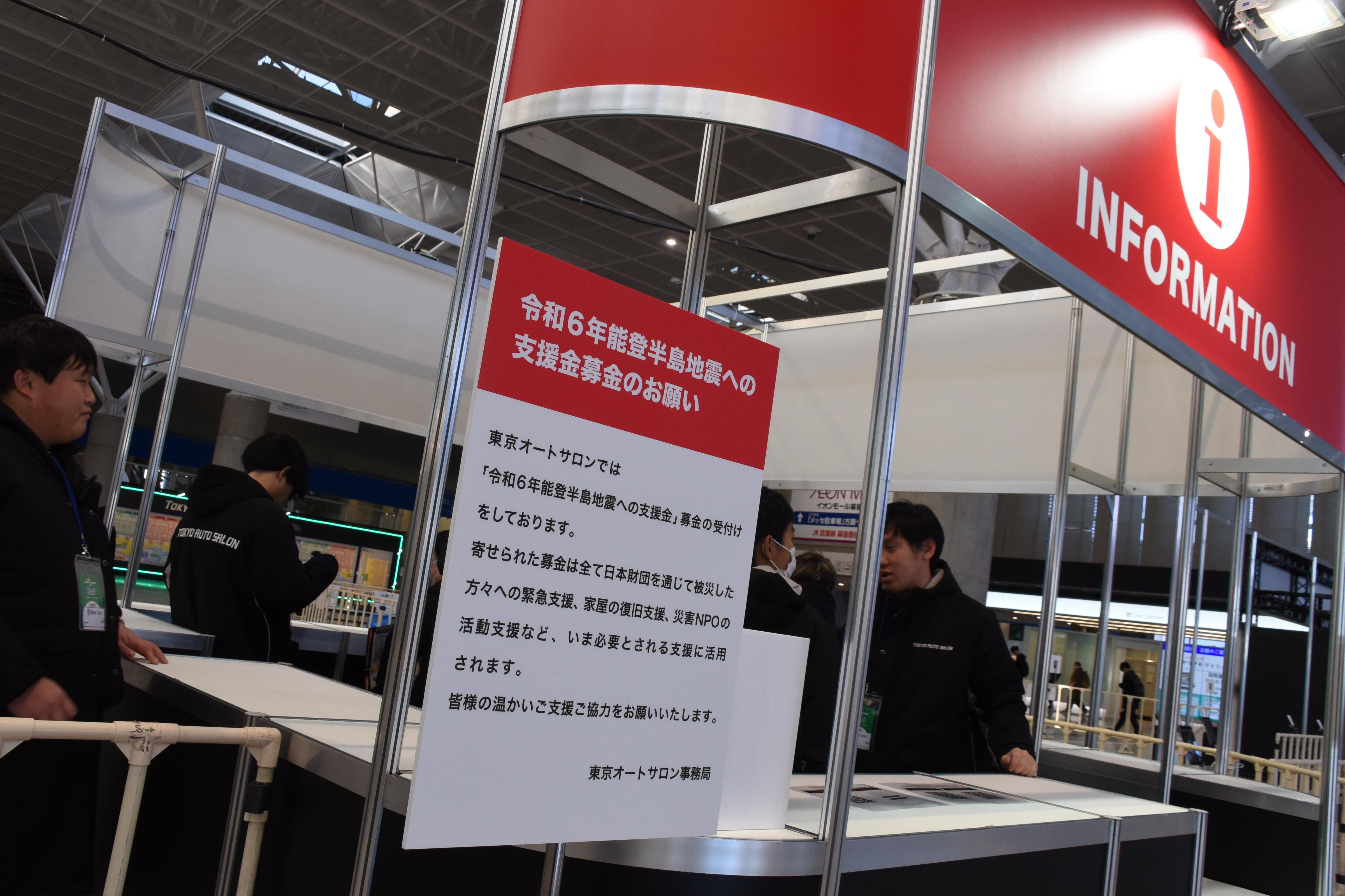 東京オートサロンでは、年明けに発生した「令和6年能登半島地震への支援金募金」を行うこととしました。この地震により犠牲となられた方々とご遺族に謹んでお悔やみを申し上げ、被災された皆様に心からお見舞い申し上げます。今回、インフォメーション(メインゲート・中央ゲート付近)に募金箱を設置しました。寄せられた募金は全て日本財団を通じて被災した方々への緊急支援、家屋の復旧支援、災害NPOの活動支援など、いま必要とされる支援に活用されることとなります。