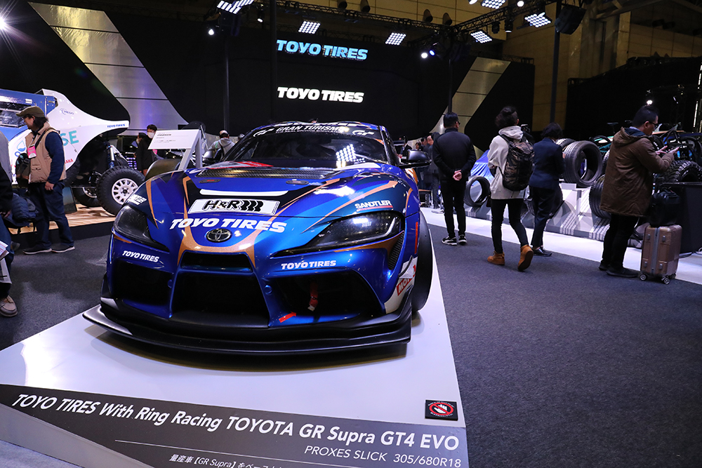 TOYO TIRES(東ホール8)では、この東京オートサロン2024会場で初披露したマッド・マイク選手のマツダ・サバンナRX-3や現在ダカールラリーに参戦中で水素燃料エンジン実験車HySE-X1のレプリカ車など合計6台のレース&カスタムカーと共に、そのテーマに合わせたタイヤの展示や、様々なステージイベントを展開しています。同社のスポーツ系フラッグシップタイヤブランド「PROXES」シリーズでは、「R888R」や「R888R Drift」をはじめ、2023年12月に発売開始されたばかりの低燃費コンフォートタイヤ「PROXES CF3」。また、SUV 用タイヤブランド「OPEN COUTRY」の大人気定番モデル「OPENCOUTRY R/T」や「OPENCOUTRY A/T III」などの多彩な商品と共に並ぶ、各車両の存在感は圧巻です。
