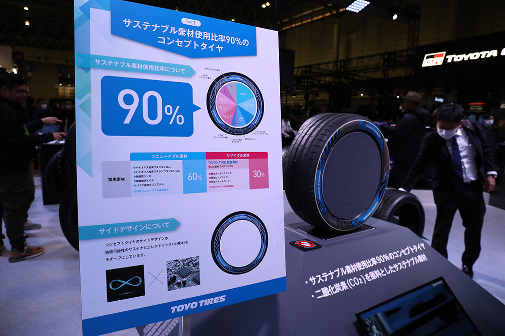 TOYO TIRESが開発を続ける使用原材料の90%にサスティナブル素材を用いたコンセプトタイヤも展示中。タイヤのサイドは、サスティナブルとエレクトリックがモチーフ。