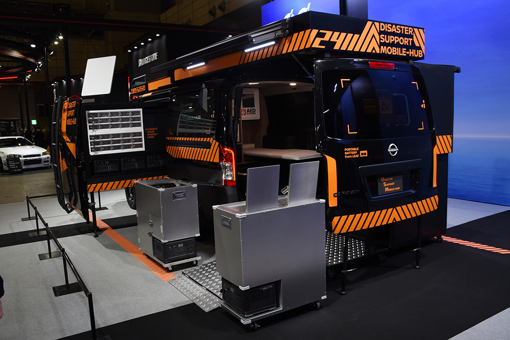 他にも、コンセプトカーとしては、キャラバンをベースとし、緊急・災害時に防災拠点になる支援車「Disaster Support Mobile-Hub」。ボディが拡張し、「ポータブルバッテリー from LEAF」を複数搭載することで、避難時のライフラインを維持し、いろいろな困りごとを解決できる装備を搭載した1台となります。