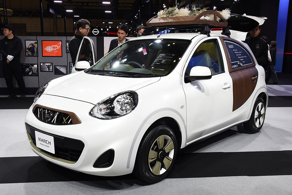 さらに国内販売が終了しているK13型マーチをベースとしたコンセプトカー「MARCH Patissier CONCEPT」は、昨年のこのオートサロンで登場した、キューブの中古車ベースのコンセプトカーに続くシリーズとなる。今回は「パティシエ」をテーマにカスタマイズを施しています。