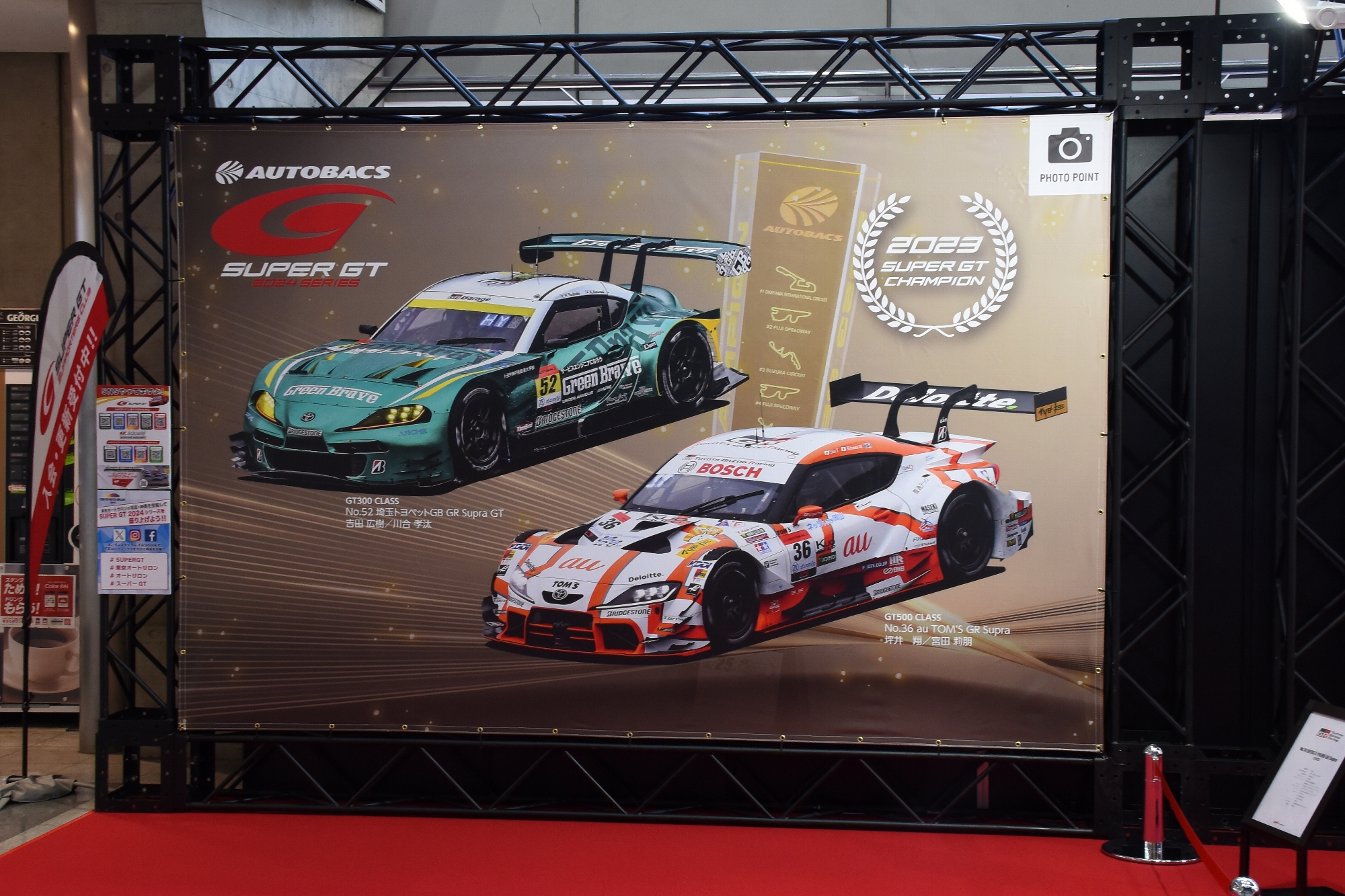 さらに昨年のGT500、GT300チャンピオン車両(No.36 au TOM'S GR SupraとNo.52 埼玉トヨペットGB GR Supra GT)で構成されたイメージ画像のフォトスポットも登場。ここでは記念撮影も可能だ。