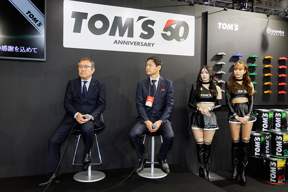 ブースで開かれたプレスカンファレンスには舘信秀会長と、谷本勲社長が登壇されました。TOM'Sの50年史と共に、これからのさらに50年を見据えた展望などが語られました。