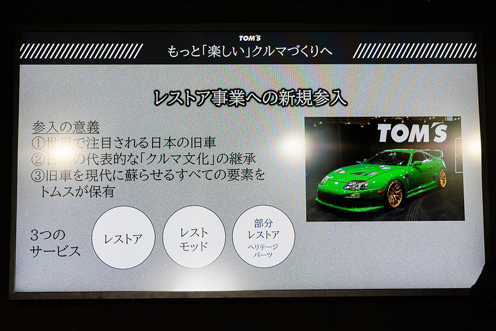 アンベールがなされたスープラとともに「レストア事業への参入」の説明がありました。TOM'Sが培ってきた経験と知見を基軸に、日本のクルマ文化継承を繋いでいきたいとの事です。
