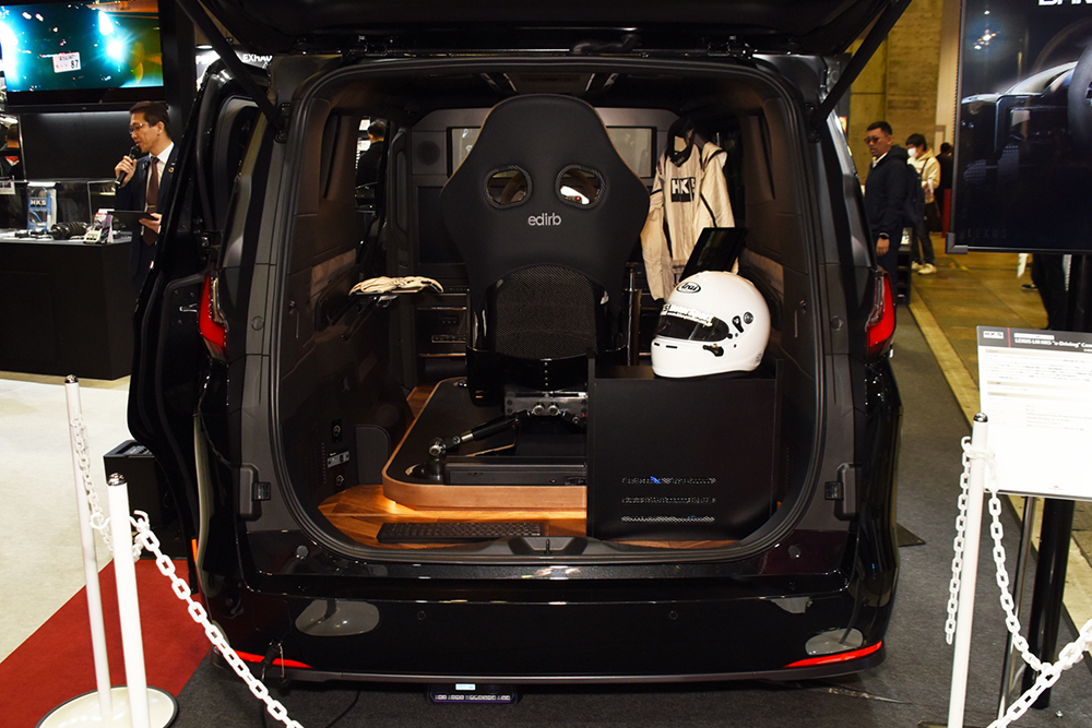 他にもLEXUS LMをベースに「スタイリッシュ&コンフォータブル・スペース」をコンセプトにサーキットへの移動を楽しむ提案として「LEXUS LM HKS“e-Driving”Concept」を出品。リアのPassengerエリアには、移動時もサーキット走行を楽しむということでドライビングシュミレータ―が搭載されています。