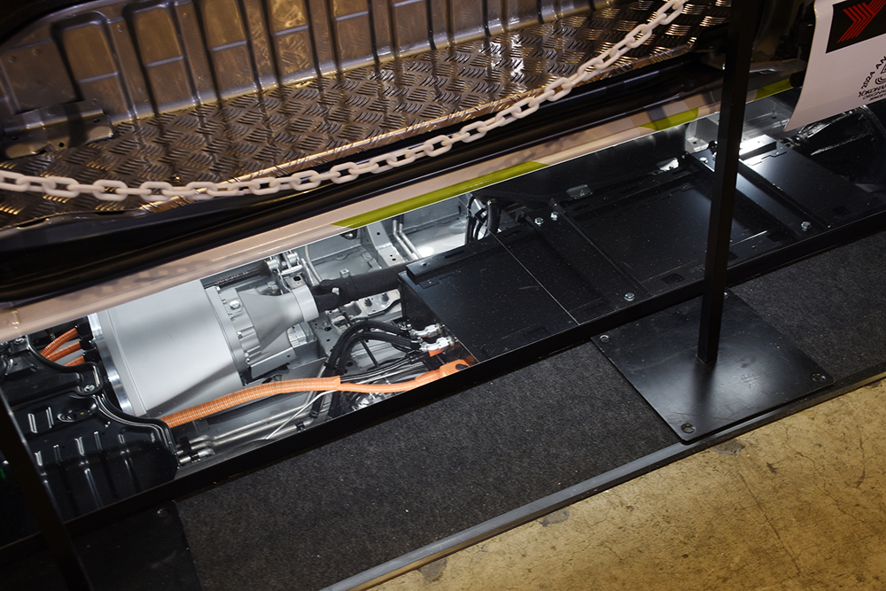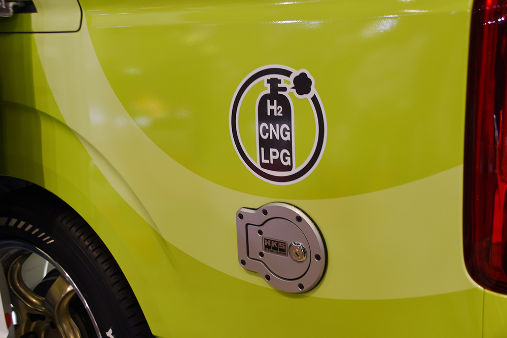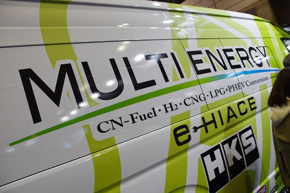 さらに、同じくトランスポーターとして車内にバイクを積載したハイエース「HKS e-HIACE”Multi Energy”Concept」も登場。こちらは、200系トヨタ・ハイエースのワイド・スーパーロングをベースにHVコンバージョンキットを組み込み、いわゆるシリーズハイブリッド化した車両。容量25kWhほどのバッテリーを搭載し、そこへ直接外部からの給電はもちろん、エンジンを使用してジェネレーターで発電をし、バッテリーにチャージすることも可能。これらのHV化のシステムはすべて床下に配置が可能となっている。また、エンジンに使用する燃料には、カーボンニュートラル燃料を想定し、さらに液体燃料と気体燃料の両方を使用可能という。
