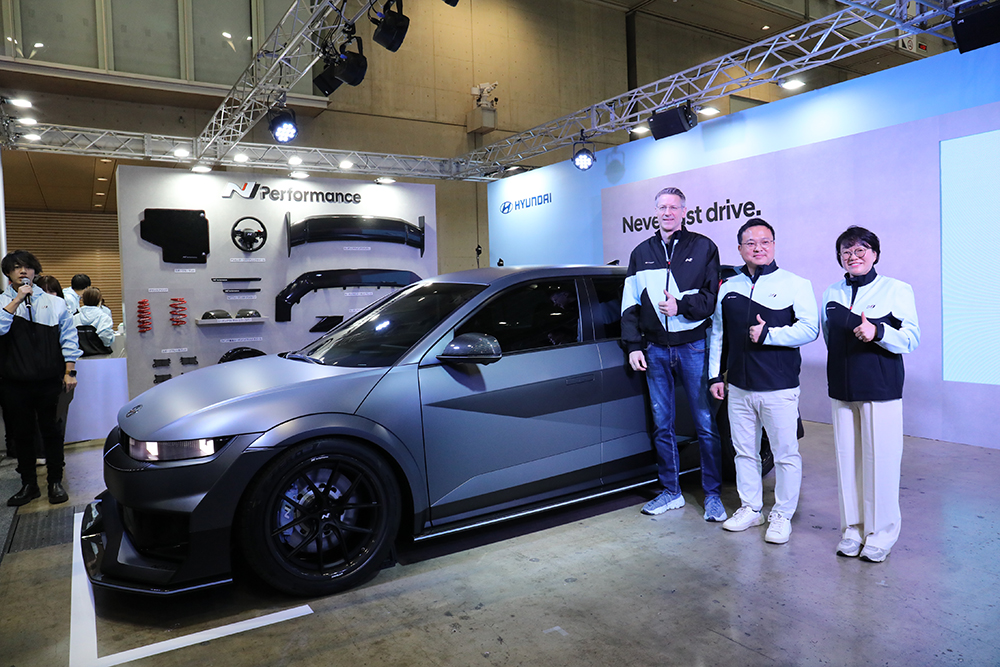 最後のフォトセッションでは、ジューン氏と共に、Hyundai(ヒョンデ)モーターカンパニーとNブランドの副社長ティル氏達も登場しました。なお、13日(土)11時~11時30分と14日(日)11時~11時30分には、屋外展示室にてデモドリフトランとドライバートークショーも実施。デモランドライバーは、谷口信輝氏、チョ・ソング氏、加藤正将氏が担当するので、お見逃しなく!