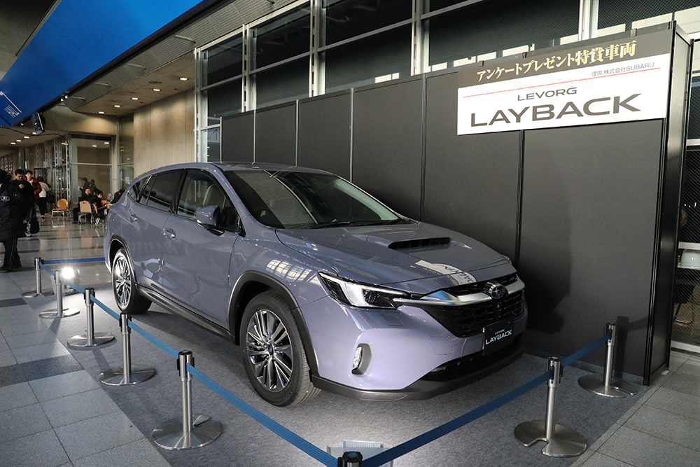 アンケートプレゼントのコーナーは、幕張メッセ中央ゲートを入って右手にある。中央ゲート正面には大きな会場案内図があるので、その右方向に歩いて、中ホール4入口前に全商品の写真展示パネルが設置されているぞ。なお、その反対側、中央ゲートから左手に向かいトミカブースを過ぎた先。東ホール7の入り口前、正面にスーパーGTブースがある目の前には、このアンケートプレゼント特賞である「スバル レヴォーグ レイバック リミテッド EX」も飾られているので、実車を見ながら妄想に耽るのも楽しいだろう。