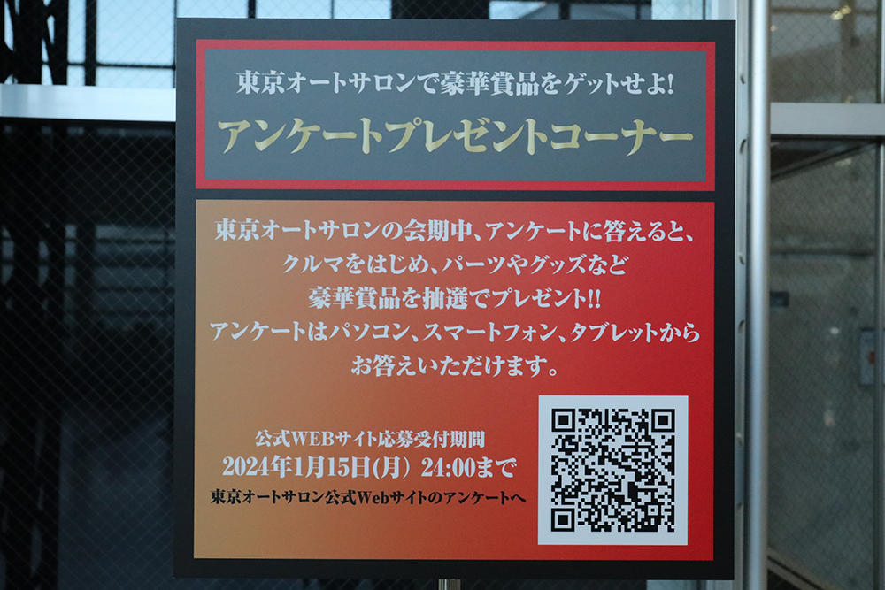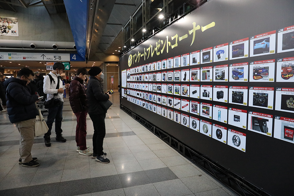 東京オートサロンの恒例と言えば、忘れてはいけないこちらの企画。来場者全員に平等にチャンスがあるアンケートプレゼントを、今年も絶賛開催中! 会期中にアンケートに答えるだけで、もしかしたらクルマが当たる?! クルマが外れたとしても、ホイールなどの豪華なパーツや、すぐに役立つアイテムを抽選でプレゼント!!