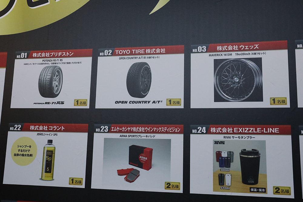 クルマを当てるのは無理だと最初から諦めてしまった人は、壁一面に並んだ協賛各社様による対象商品を隅々までご覧あれ! 今年は合計108種類もの商品をご提供いただいたため、かなり多くの皆さんに当選する確率あり! 当選者数が10名にも上る商品もちらほら見かけるので、よく吟味しよう。