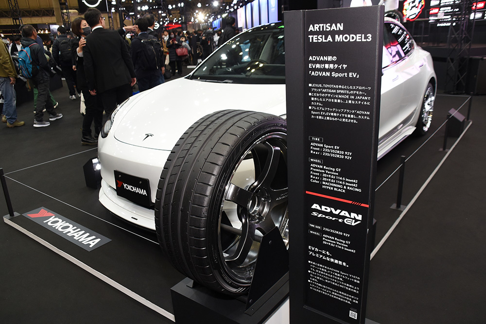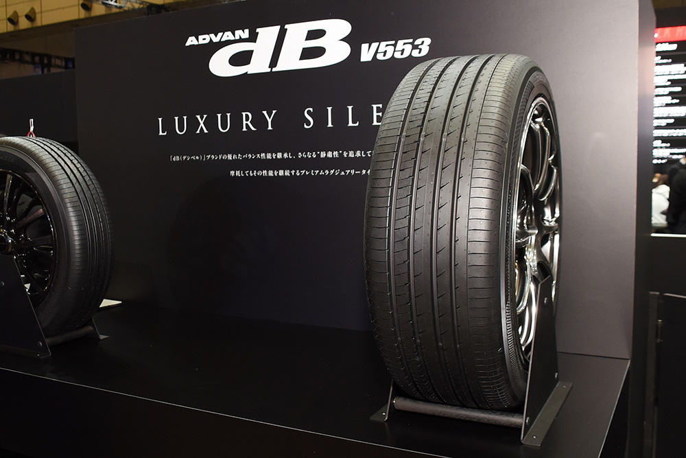 昨年発表されこの2月から発売予定のプレミアムコンフォートタイヤ「ADVAN dB V553」は受付の真横に展示されており、注目です。他にも、アドバン初のEV向け専用タイヤ「ADVAN Sport EV」など新製品を中心に商品ラインナップを多数展示しています。