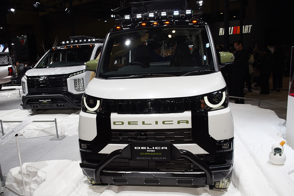 また、「デリカD:5」と「デリカミニ」の2台は、「CHAMONIX」をベースに、雪道を安心して力強く駆け抜ける頼もしさと、ウィンタースポーツを通じて家族や仲間と楽しむイメージでカスタマイズした「CHAMONIX SNOW GEAR」という同じテイストのカスタマイズが施された2台を並べて展示しています。