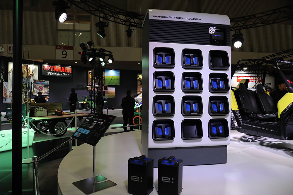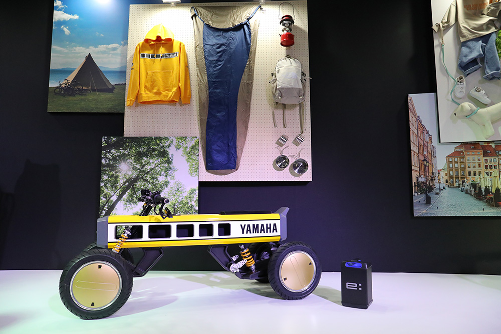 ここに展示されているEVコンセプト車両に共通しているのは、全ての車両で、ホンダが提案する着脱式可搬バッテリー「ホンダモバイルパワーパック」が使用されていることです。空になったバッテリーが充電されるまで待つのではなく、交換することで、連続して稼働できる状態にする。しかも、この「ホンダモバイルパワーパック」を、メーカーの垣根を越えて各車の小型モビリティなどに活用することで、新たな可能性を見出す。その実現に向けてヤマハが導き出した未来が、今回の展示車で表現されているのです。