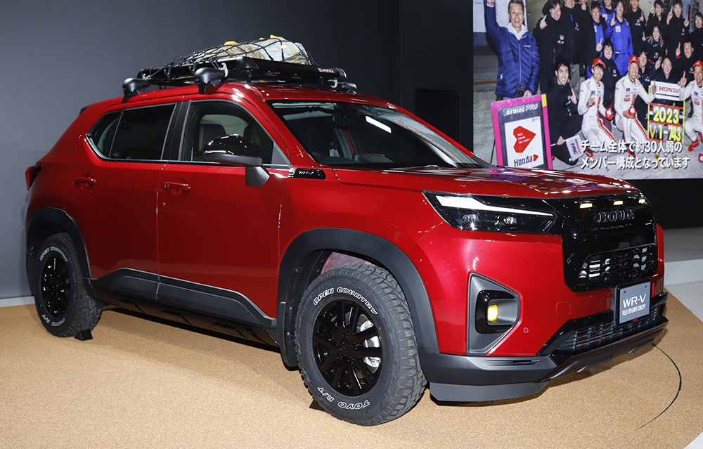 もう1台、多くの注目を集めそうなのが新型WR-Vの「フィールドエクスプローラー コンセプト」です。ホンダ車向け純正アクセサリーを開発・販売するホンダアクセスが手掛けたこのモデルは、WR-VをよりSUVらしく仕立てたもの。専用開発されたフロントグリルには3個のマーカーが内蔵され、ブラックに塗装された前後ガーニッシュ類やルーフキャリアを装着。ホイールは純正の17インチから15インチへと小径化され、TOYOオープンカントリータイヤの装着により、「タフ&ラギッド」な印象が強められています。