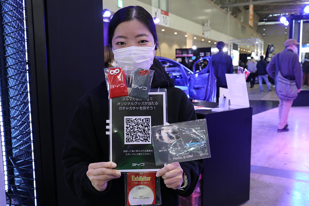 会場内では、メルマガを登録してくれた方に、オリジナルグッズが当たるガチャガチャも実施中。特賞はオリジナルのモデルカーで、そこに土屋圭市さん、または塚本奈々美さんのサインが入っているというスペシャル品! このお二人は、中国で開催されたBYDのイベントにゲストとして招待され、現地でドリフトなどのデモランを披露しているのです。万が一特賞が外れたとしても、お守りやステッカーのいずれかは必ず当たるというハズレくじ無し! EV車として世界中で注目されているBYDの魅力を、ブースで実際に触れてみましょう!