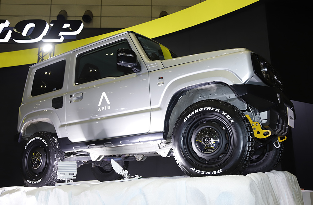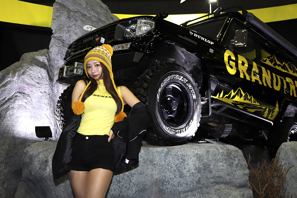 また雪上をイメージした「WILD SNOW」ゾーンには、スズキ・ジムニーAPIOカスタムが展示されています。こちらはスタッドレスタイヤのGRANDTREK XS1を装着。スタッドレスでありながら、オフロードタイヤのようなトレッドパターンが魅力のGRANDTREK XS1は、まさにジムニーにベストマッチ。サイドウォールのホワイトレター処理は片面だけとなっているため、反対側を表側に組めばカスタムカーの雰囲気を抑えて使用することもできます。