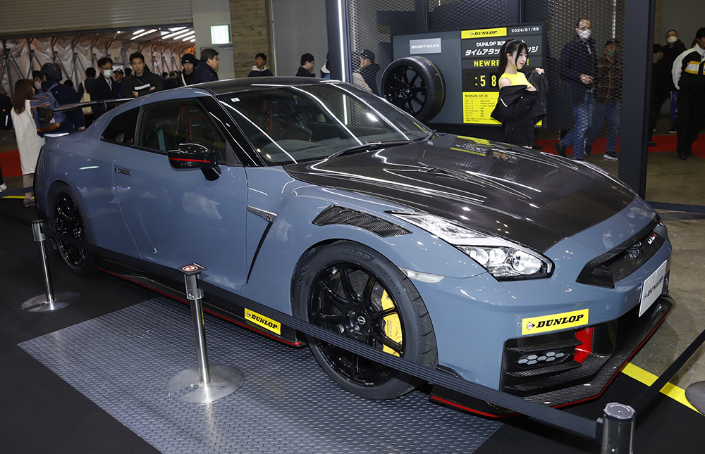 まずはブースの通路に面したゾーンを「CRAFTMAN GARAGE」とし、DUNLOPのスポーツタイヤ「SPORT MAXX」を装着する日産GT-Rが並べられました。このSPORT MAXXは、ニッサンGT-R専用に開発されたモデルのプロトタイプ。東京オートサロン2024の直前である1月9日には、筑波サーキットTC2000でタイムアタックが行われ、58秒820を記録したそうです。
