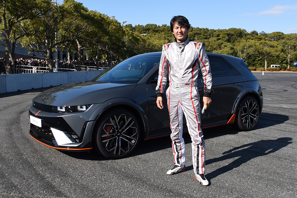 「N moment / Hyundai」では、そのNブランド初の電気自動車となる「IONIQ 5 N」が最初に登場しました。こちらは2024年に国内で市販予定の車両で、このデモランを行ったのは谷口信輝選手でした。駆動力配分を前後に自由に配分できることからドリフトも簡単にできるということで、派手なパフォーマンスも自由自在です。また基本的には大きな音を発生しないEVですが、この車両ではあえて3つの音を発生させることができ、まるで内燃機関車のようなエキゾーストノートを聴きながら走行を見ることができました。