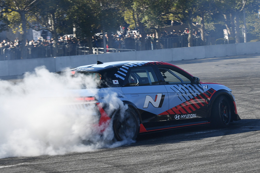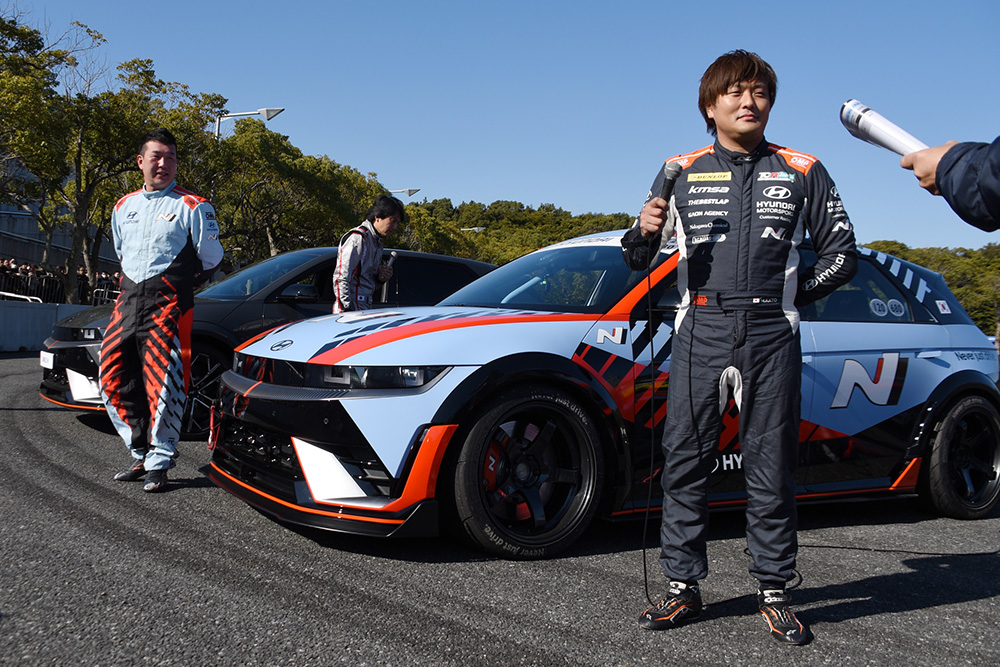 続いて登場したのは、Nのカラーリングが施された同じく「IONIQ 5 N」のドリフトスペック(ドライバーはチョ・ソング選手)。こちらも基本的には市販車と同じスペックで、サイドブレーキレバーを装着し、よりドリフトをしやすいモデルだということです。