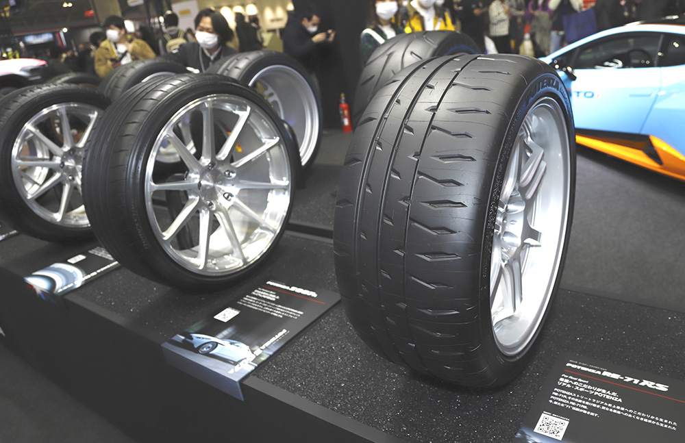 そのほかPOTENZAタイヤを純正装着する車両として、ランボルギーニ ウラカン STOが展示されたほか、チューニングカーとしてR34型日産スカイラインGT-Rの姿も。こちらには開発車両との表記があり、「POTENZA RE-71RS」が装着されていました。