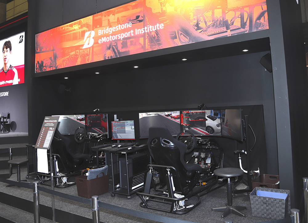 さらにブリヂストンが描く未来は、実車の世界だけには留まりません。車両の傍らには、スポーツタイヤブランド「POTENZA」の各製品が展示されたほか、eモータースポーツの体験型プログラム「Bridgestone eMotorsport Institute」の体験コーナーも設置されています。