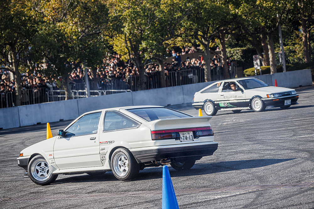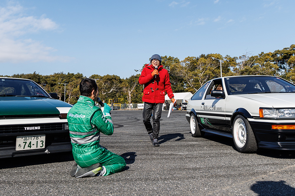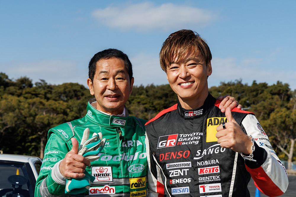 レジェンドの意地を見せたかったところですが、「今回は負けを認めよう」勝負の後には健闘を讃えあってサムズアップでパシャリ、笑顔の2人と2台のハチロクなのでした。