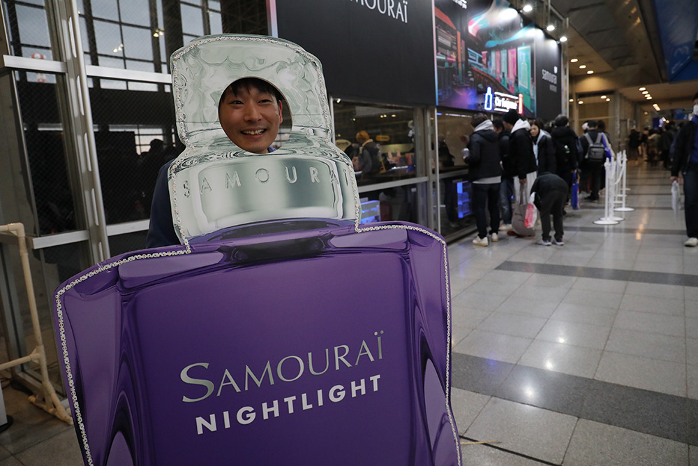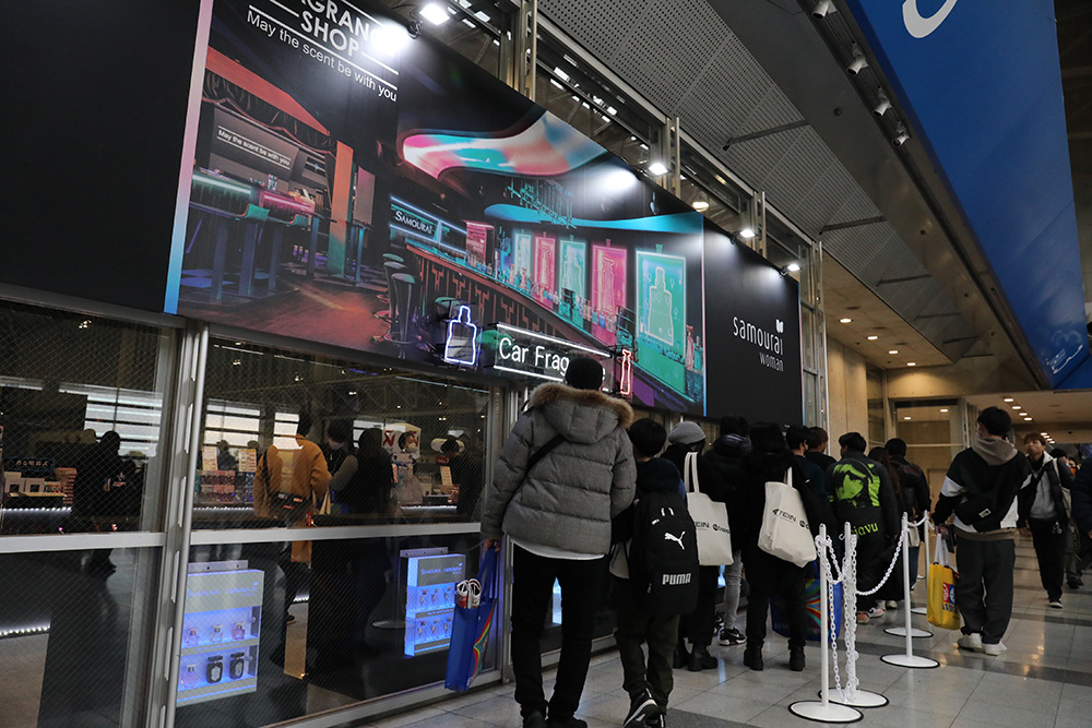 東京オートサロンと言えば、これがなくては始まらない! お馴染みの香水ブランド、「SAMOURAI(サムライ)」が、今年も西ホール前の2階メイン通路に登場した。2日目土曜日もブース前に長蛇の列が並んでおり、このブランドの人気が伺える。
