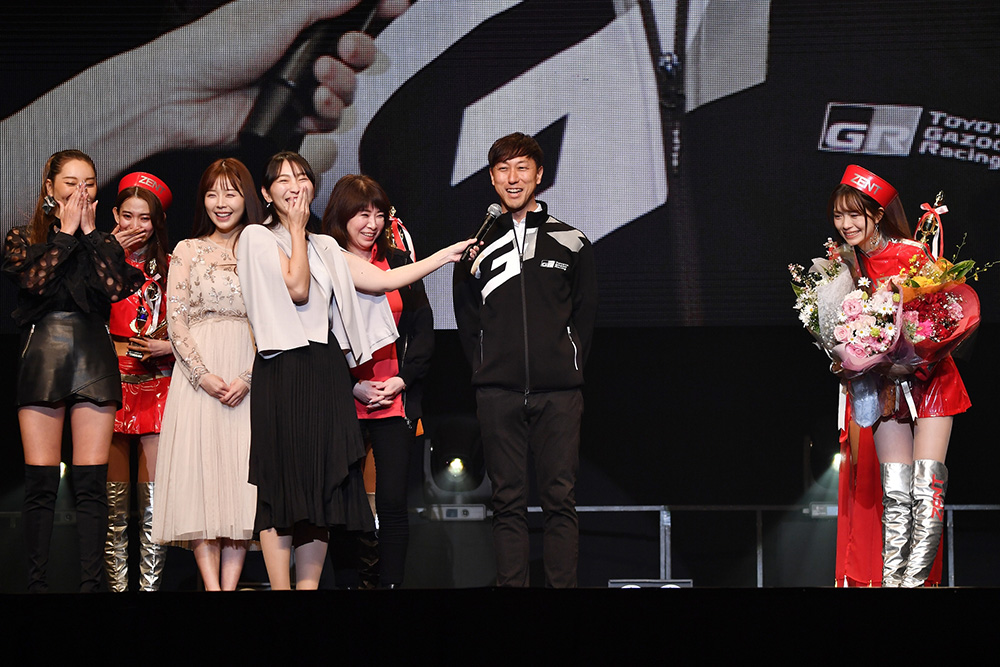 そして、昨年の2022年レースクイーン大賞グランプリを受賞している名取くるみさんから、2023年のレースクイーン大賞グランプリが発表され、松田蘭さんがこれを受賞しました。この場には、ドライバーの石浦宏明選手をはじめ、チーム関係者も花束をもって駆け付け、涙、涙の授賞式になりました。