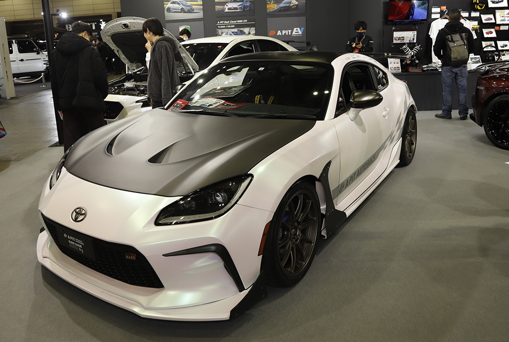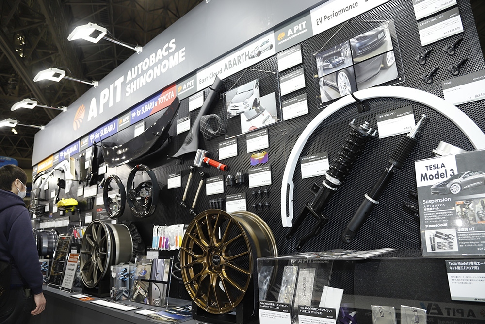通路を挟んで向かい合う「A PIT AUTOBACS」ブースでは、A PIT AUTOBACS SHINONOMEがカスタマイズしたテスラ・モデル3、トヨタ・GR86、アバルト595、スバル・WRX S4の4台と、スーパーオートバックス浜松がカスタマイズした日産・フェアレディZの計5台を展示。車両の傍らには両店舗のスタッフが常駐しているので、装着パーツについての詳細を聴けるほか、カスタムやメンテナンス、あるいは店舗イベントの予定についてなど、様々な相談ができちゃいます。