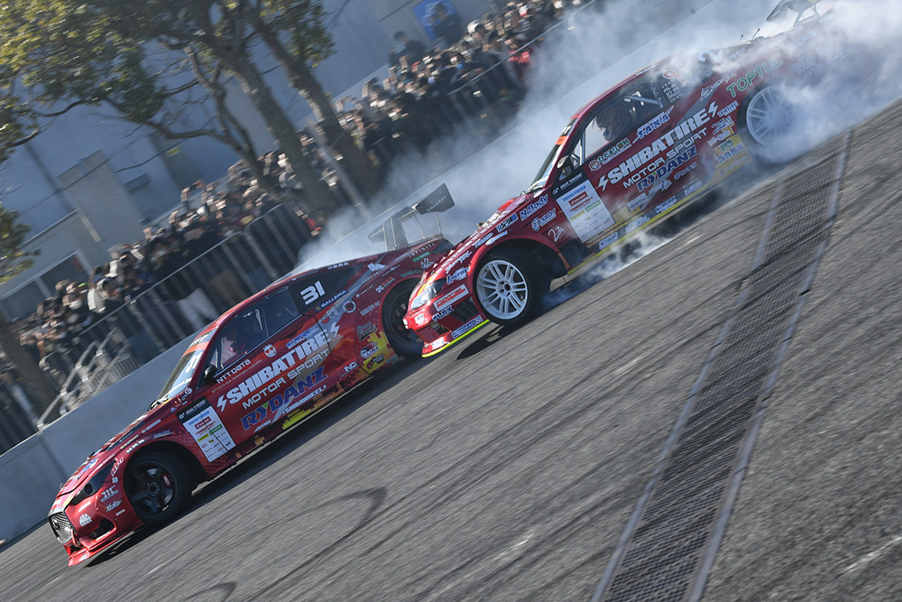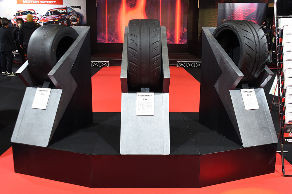 今回の東京オートサロンの出展「SHIBATIRE/RYDANZ(北ホール9)」では、モータースポーツ系主力タイヤ3種を中心に展示をしています。また、屋外イベント会場で行われる「D1 Kick Off Drift」にもシバタイヤレーシングの車両がデモランを行っています。