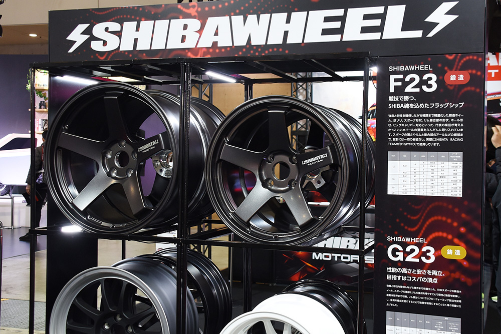 元祖シバタイヤといえる「R23」、D1GPのレギュレーションをクリアするために開発された「R31」、スリックタイヤの「R60」といったモータースポーツに特化した主力タイヤのサイズラインナップの拡充に向け、その商品をアピールしています。さらにD1でも使用されている鍛造ホイール「F23」や鋳造ホイールの「G23」といったSHIBAWHEELの紹介も行っています。