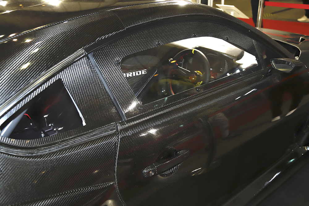 そんなインフュージョンカーボン素材は、前後バンパーやスポイラーといったエアロパーツだけでなく、純正形状のルーフや左右ドアといったボディパーツにも使用されています。また前後フェンダーは片側40mmのワイド化を実現、大迫力のフォルムを演出しています。