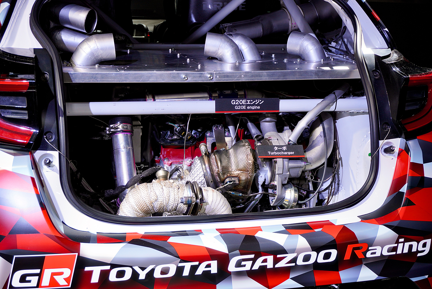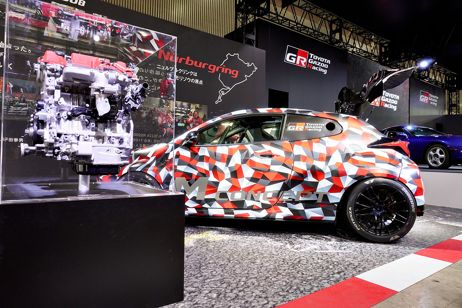 モザイクカラーの後ろを向いたGRヤリスには、ミッドマウントされたG20Eターボエンジンが搭載された状態で展示されています。これは、会場で必ず見たいコンセプトカーといえるでしょう。